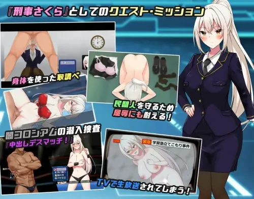 除执行特殊任务的战斗模式外,日常在“刑事课”作为刑警活跃。任务型游戏中包含可自由接取的任意任务,以及推进剧情发生的主线任务。通过完成这些任务,积累作为刑警的经验。运用女性的身体,进行审讯、说服犯人、解决事件吧!