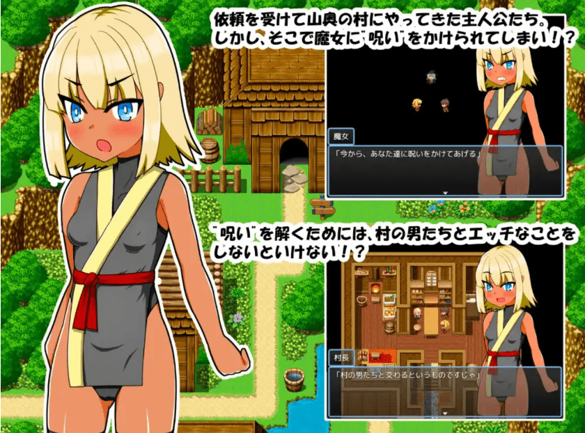 -主人公来到深山中的一个村庄,请求消灭恶魔。他们以为这只是一个简单的请求,但当天晚上,一个住在森林里的女巫对他们下了他们以为这只是一个简单的请求,但当天晚上,一个住在森林里的女巫对他们下了 “诅咒”!“诅咒”!破解诅咒的唯一办法就是与村里的男人发生性关系。为了解除诅咒,女主人公别无选择,只能与村里的男人发生性关系。诅咒 “真的会解除吗?会发生什么?选择你想与之发生性关系的人,然后偷偷看一下现场!一款迷你 RPG 游戏,只需一小时即可掌握!
