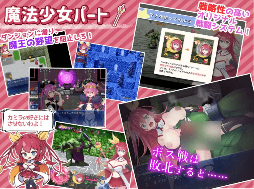 主人公莉穗-贝宁是一个拥有大奶子的,原本过着平静的生活,但在某次事件后,她卷入了魔王的野心,并觉醒了魔法少女“月亮公主柯内莉亚”的力量!JK魔王计划通过催眠电波让城市中的每个人都变得情欲勃发,并收集性行为产生的“性能量”,从而复兴城市。 ……。这个女孩有时会受到严重伤害,但她仍继续努力战斗,阻止魔王的野心。 ……!无论是整天以魔法少女的身份战斗,还是以如花似玉的JK 的身份享受校园生活,放学后在俱乐部和街机游戏厅玩耍,对于一个同龄女孩来说,她有很多事情可以做。 ……!学校生活部分主要是探索和日常生活中潜伏的情色事件、魔法少女部分主要是战斗情色和地牢中的击败情色,H-event 是一个很平衡的H-event!各种子角色的H-event 也很多!被催眠电波弄疯了的世界伦理袭击了生活在小镇上的每一个人。 ……!她能否粉碎魔王的野心,回到从前平静的生活,还是能…….?