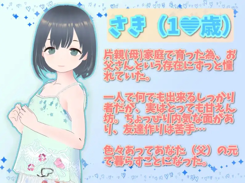 你的女儿“小咲”和你可以在各种情境下发生性关系,或像普通父女一样生活。让小咲成为她心目中和你心目中理想的父亲吧。◆彻底的日常生活模拟- 使用无变形的3D图形全面再现!女主角会按照一天的时间表,起床刷牙、上厕所、洗澡等自由生活。你可以闲聊、给她做饭、进行性行为等各种干预。并且也可以偷拍小咲在厕所或浴室的情景。
