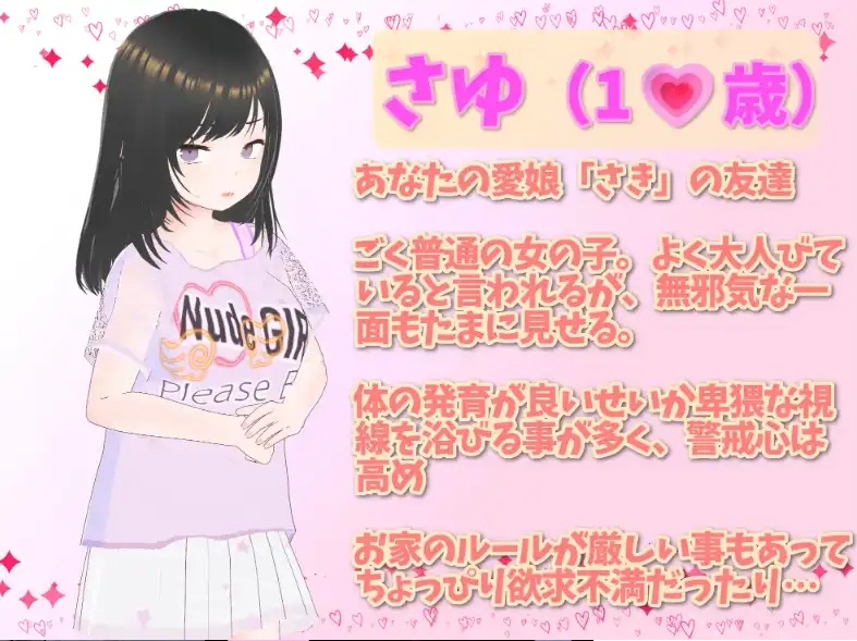 ◆肚子鼓鼓地、怀孕如果不做避孕措施就会怀孕…!可以享受怀孕状态下的日常生活和性行为!DLC:- 娘的朋友新情况!安装这个DLC后,女儿的朋友“小雪”会来玩。小雪会和妍聊天,玩耍,表现得像个朋友一样。- 在保持本体自由度的基础上,和小雪互动!可以教小雪学习,一起玩游戏,真诚地对待她,也可以在厕所里溜进去,偷拍,偷偷捉弄她。如何对待取决于你!- 增加更多的情趣!实现3P!除了和小雪两个人发生关系之外,还可以享受三人一起的甜蜜性关系,实现3P!- 特典介绍:特别剪辑了部分音频作品“理想的父亲 ~父与女的秘密录音~”(19分22秒)作为特典附赠!游戏累了,也可以只听音频!- 朋友“小雪”- 新增3P性关系!- 不同情况下的3P性行为!从标准的W性行为,W口交,到同时排泄秀,同时排泄,甚至到独特的性体位都有!- 当然,也可以和小雪两个人进行性行为。- 日常生活更加丰富!理想的父亲 朋友DLC [猫3]- 更多温馨元素!随着小雪的加入,新增了更多温馨元素!可以教小雪学习,一起玩游戏,聊天…- 惩罚要素:新增了屁股拍打惩罚!如果有失误像失禁之类的,可以给她屁股拍打惩罚!- 玩耍,留宿,私下召唤!理想的父亲 朋友DLC [猫3]- 在不同情况下和小雪互动!小雪会到女儿的儿子玩,留宿,私下召唤…来的目的各不相同。在此期间可以有多种互动方式。- 如果留宿,可以一起洗澡,对睡觉的小雪捉弄…- 私下召唤,私下一起调情…