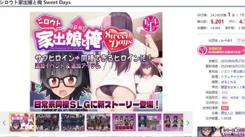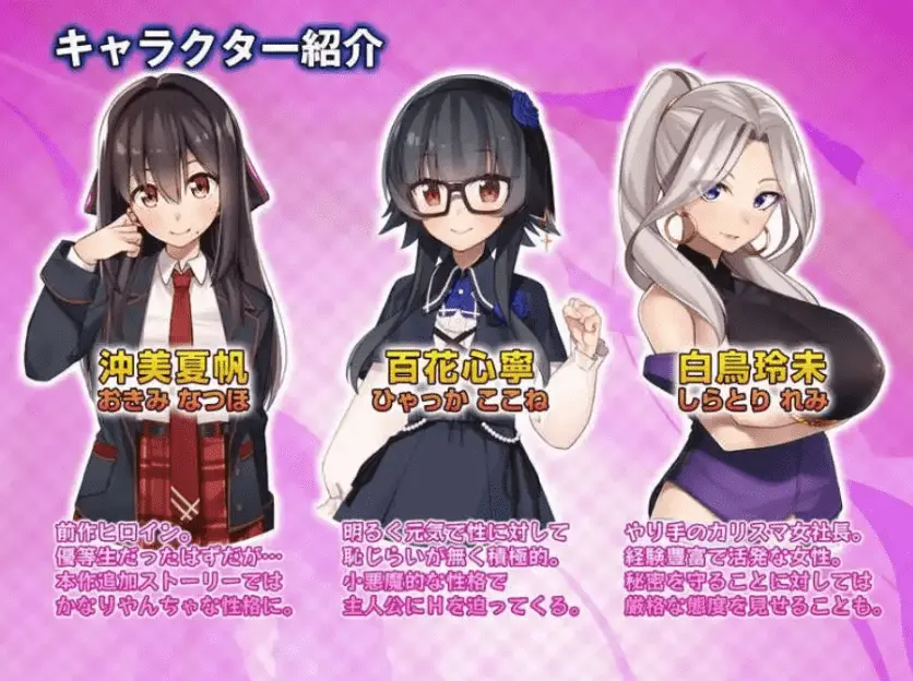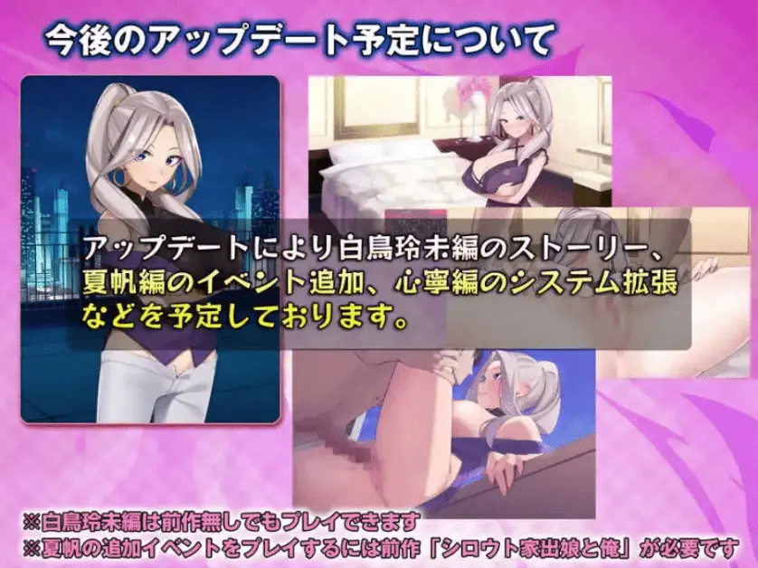 故事1:冲美夏帆篇与重返女子高中生(?)身份的女主角夏帆共度“梦境中的奇妙校园生活”在梦世界(Dream World)成为教师的主人公”我”,与沦为不良学生的夏帆。两人能否顺利度过这场学园性活!?※此为游戏正篇的追加剧情※游玩本故事需持有前作《素人离家少女与我》故事2:百花心宁篇与正篇稍有不同的IF世界故事——“与魅魔的同居生活”被自称百花心宁的女性救下性命的主人公,却因她显露魅魔本性而被强行签订契约,开始了限时同居生活。每日被迫面临榨精危机的”我”命运将如何!?※无需前作亦可单独游玩游戏介绍(致初次接触本作的玩家)这是一款与女主角共同生活、培养信任与爱情的同居模拟SLG。H场景全程语音!搭载配合多样动作的动画插入演出,以及根据女主角状态实时变化的背景语音系统。新增服装·追加道具说明追加了夏帆H场景可用的5种新服装与6种成人道具。部分场景更支持”孕肚”玩法。※此为游戏正篇追加内容※使用夏帆服装及道具需持有前作《素人离家少女与我》后续更新计划预计通过更新追加白鸟玲未篇剧情、夏帆篇新事件、心宁篇系统扩展等内容。※白鸟玲未篇无需前作即可游玩※夏帆追加事件需持有前作《素人离家少女与我》角色介绍・冲美夏帆前作女主角。本应是个优等生…在本作追加故事中却展现出相当顽劣的性格。・百花心宁开朗活泼且对H毫无羞耻心的积极派。看似小恶魔性格,意外有着纯情的一面!?・白鸟玲未干练的精英女社长,经验丰富行动力强。对保守秘密一事会展现出异常严格的态度。[关于不同发行商的前作组合使用]Q:能否将其他发行商的《素人离家少女与我》游戏包与《Sweet Days》联动?A:可以。不同发行商的前作游戏内容完全一致,均可正常联动。更新日志:游戏简介大型更新第一弹介绍大型更新第一弹已上线。和心宁一起经营成人用品店,赚取巨额财富吧!本次更新聚焦于心宁篇!新增了结局后的故事,现在可以无限畅玩了。此外,心宁篇的 H 场景新增了 5 种可使用的成人用品,还添加了新的成就。※可以从过去版本的存档数据继续游玩!故事 1:冲美夏帆篇与回到女高中生身份(?)的女主角夏帆一同度过“梦中奇妙的校园生活”在梦世界(Dream World)里成为教师的主人公 “我”以及变成不良学生的夏帆。两人究竟能否顺利度过校园里的情爱生活呢!?※这是对本篇的追加事件※游玩本故事需要前作《新手离家少女与我》故事 2:百花心宁篇与本篇略有不同的 IF 世界的故事……“与梦魔的同居生活”主人公曾被一位名叫百花心宁(ひゃっか ここね)的女性救了性命,然而……露出梦魔本性的她强行让主人公签下契约两人开始了有期限的同居生活。每天都被逼迫榨精的 “我”,命运将会如何!?※本故事无需前作也可游玩游戏介绍(给初次了解本作的人)这是一款与女主角一同生活,加深信赖与爱情的同居模拟游戏(SLG)。H 场景全程配音!采用了对应各种动作的动画插入效果,以及根据女主角的状况实时变化的背景语音。新服装・追加物品相关新增了 5 种夏帆在 H 场景中可使用的新服装和 6 种成人用品。此外,在部分场景中还可以进行 “大肚子” 性爱。※这是对本篇的追加事件※使用夏帆的服装及物品需要前作《新手离家少女与我》今后的更新计划在今后的大型更新中,计划推出白鸟玲未篇的故事、夏帆篇的事件追加等内容。※白鸟玲未篇无需前作也可游玩※游玩夏帆的追加事件需要前作《新手离家少女与我》